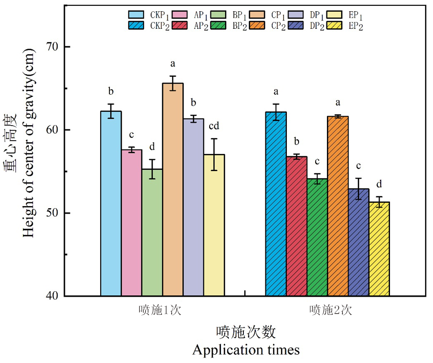 | Fig.2 Changes of different regulators on the center of gravity height of winter wheat under drip irrigation |