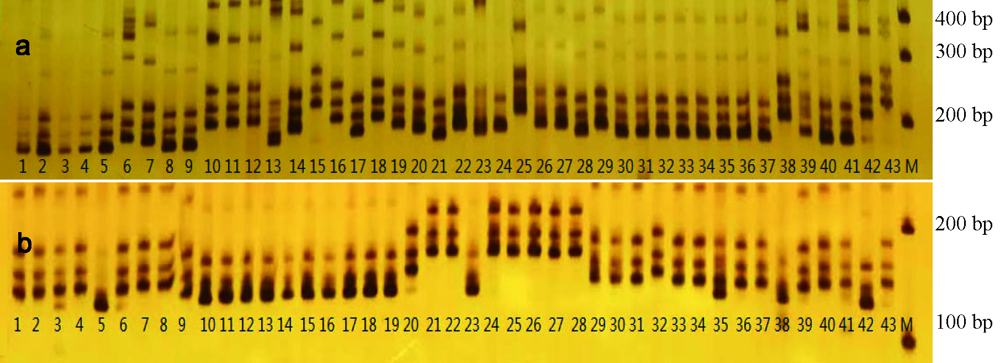 图1 两个引物(a, bnlg1702,和b, umc1084)在部分玉米自交系DNA中的扩增SSR图谱