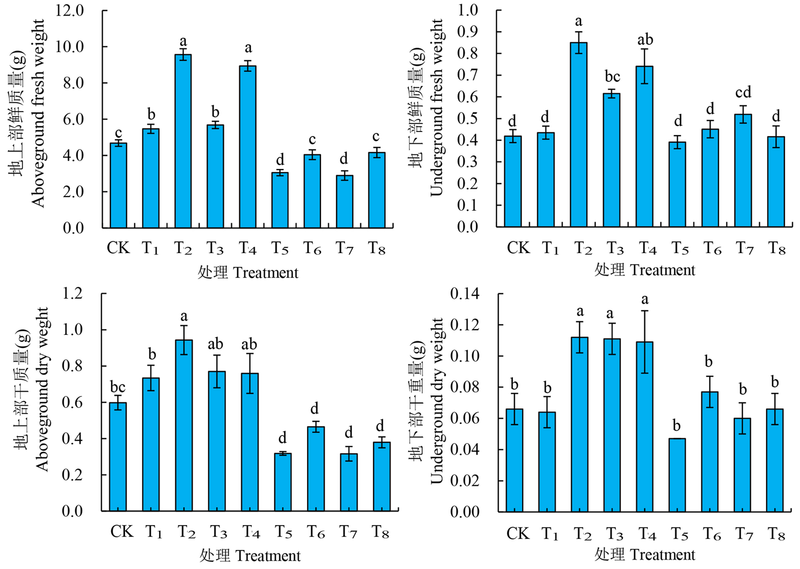 | 处理 Treatment | 全株鲜质量 Fresh weight of whole plant(g) | 全株干质量 Dry weight of whole plant(g) | 干鲜比 Dry and fresh ratio | 根冠比 Root shoot ratio | 壮苗指数 Strong seedling index |
