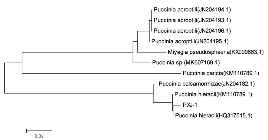 【Objective】 This project aims to identify the pathogen causing Taraxacumkok-saghyz Rodin rust disease and provide scientific basis for the effective control of the disease. 【Methods】 According to Koch's rule, the pathogen of rubber grass rust in the field was isolated and inoculated with healthy rubber grass to verify its pathogenicity. The morphology of summer spores of rubber grass rust was observed under the microscope. The 28S rDNA and its gene sequences of rust were amplified and sequenced by PCR with fungal universal primer NL1 / NL4 and rust universal primer ITS5-u/ITS4rust. The phylogenetic tree was constructed by its sequence to analyze the genus status of the strain. 【Result】 The rust isolated from field samples could infect healthy plants, and the symptoms were consistent with those in the field. The summer spores of rubber grass rust were nearly spherical, oval or ovoid, and the size was (24-32×21-26)μm, light yellow to chestnut brown, spiny, single cell, wall thickness of 1-2.5 μm. Its sequence genetic analysis showed that rubber grass rust in Ili, Xinjiang was the closest to Pucciniahieracii, and its sequence homology reached 99.06%.【Conclusion】 The pathogen causing Taraxacumkok-saghyz Rodin rust disease was Pucciniahieracii.