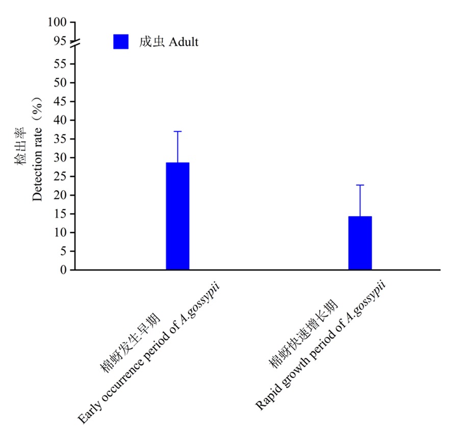 图2 棉蚜发生不同时期中甘草上多异瓢虫体内铷元素检出率 注:数据为平均值 ± 标准误差
