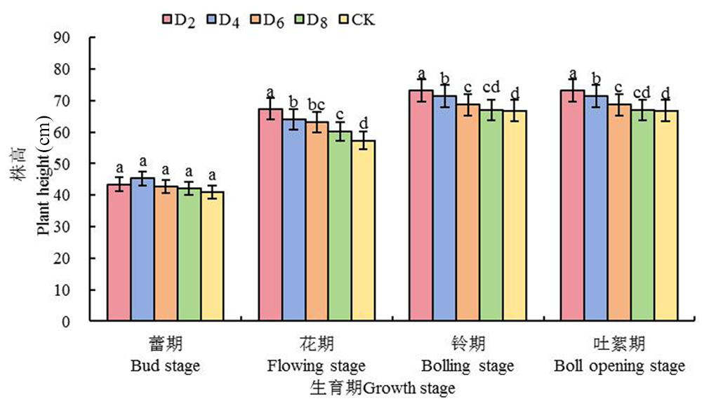 Fig. 2 Changes in cotton plant height under different irrigation frequencies Notes: Different letters indicate significant differences between treatments at the 0.05 level,(P<0.05), the same as below