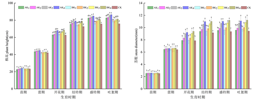 【Objective】 To investigate the effects of potash fertilizer distribution and dosage in cotton production and clarify the most suitable potassium application level for cotton growth under drip irrigation under membrane in Xinjiang. 【Methods】 Four potash dosages were set, i.e., 60, 90, 120 and 150 kg/hm2 of pure potassium (K2O), which were expressed as K1, K2, K3 and K4, respectively; and two kinds of potash fertilizers, i.e., potassium sulphate and potassium sulphate+potassium humate (1:1 ratio), which were expressed as A and B, with eight treatments in total, and no potash fertilizers were applied to CK as the control. 【Results】 The experiment showed that plant height of cotton in all treatments was greater in AK4 treatment, but not significantly different from BK4. Stem thickness reached the maximum in BK4 treatment, but there was no significant difference with AK3, AK4 and BK3;SPAD value showed a trend of increasing and then decreasing in each treatment, and reached the maximum in AK4 treatment in the boll stage, but there was no significant difference with AK3, BK3 and BK4; Dry matter accumulation increased slowly and then rapidly with the progress of fertility, and reached the maximum at the full-bell stage, and the dry matter accumulation of BK4 treatment was the highest among all treatments, but there was no significant difference with AK3, AK4 and BK3; Intercellular CO2 concentration and net photosynthetic rate at the boll stage increased with the increase of fertilizer application, and transpiration rate and stomatal conductance decreased and then increased with the increase of fertilizer application. The seed cotton yield of both potash treatments increased with the increase of fertilizer application, and the BK4 treatment had the highest yield, but there was no significant difference with AK3, AK4 and BK3. 【Conclusion】 Considering the factors together, potassium sulfate compounded with potassium humate treatment is superior to potassium sulfate treatment alone, and BK3 treatment is the best treatment.