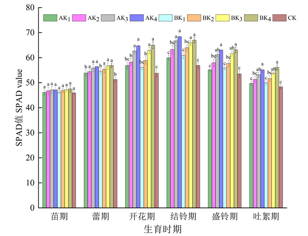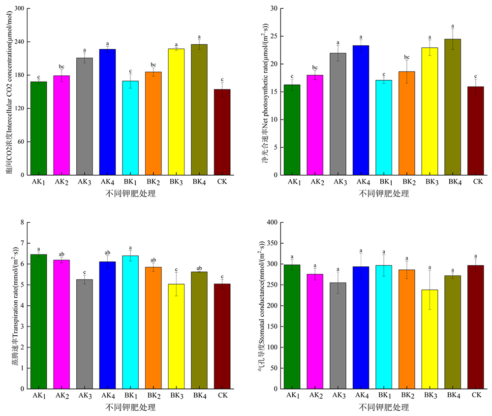 【目的】探究钾肥配施和用量在棉花生产中的效果,分析适宜新疆膜下滴灌棉花生长的施钾水平。【方法】设置4个钾肥用量,即纯钾(K2O)60、90、120和150 kg/hm2,分别以K1、K2、K3和 K4表示;设2种钾肥,即硫酸钾、硫酸钾+腐植酸钾(1∶1配比),分别以A和B表示,共计8个处理,不施钾肥CK为对照。【结果】各处理棉花株高在AK4处理较大,但与BK4无显著差异。茎粗在BK4处理下达到最大,但与AK3、AK4和BK3之间无显著差异;SPAD值各处理呈先增加后降低的趋势,结铃期中AK4处理达到最大值,但与AK3、BK3和BK4间无显著差异;干物质积累随生育期进程推进先缓慢增加后迅速增加,在盛铃期达到最大,各处理中BK4处理的干物质积累最高,但与AK3、AK4和BK3间无显著差异;花铃期胞间CO2浓度、净光合速率随施肥量的增加而增加,蒸腾速率和气孔导度随施肥量的增加先降低后增加。2种钾肥处理籽棉产量均随施肥量的增加而增加,BK4处理产量最高,但与AK3、AK4和BK3间无显著差异。【结论】硫酸钾复配腐植酸钾处理优于单施硫酸钾处理,BK3处理为最佳处理。