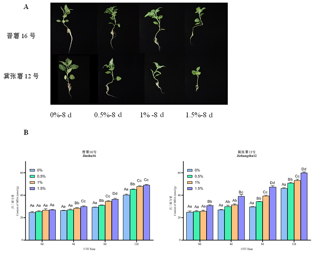 图1 (A)不同NaCl浓度的盐胁迫下晋薯16号和冀张薯12号马铃薯幼苗生长的变化(B)不同NaCl浓度(0%、0.5%、1%、1.5%)和胁迫时间(0、4、8、12 d)下晋薯16号和冀张薯12号的丙二醛含量的变化