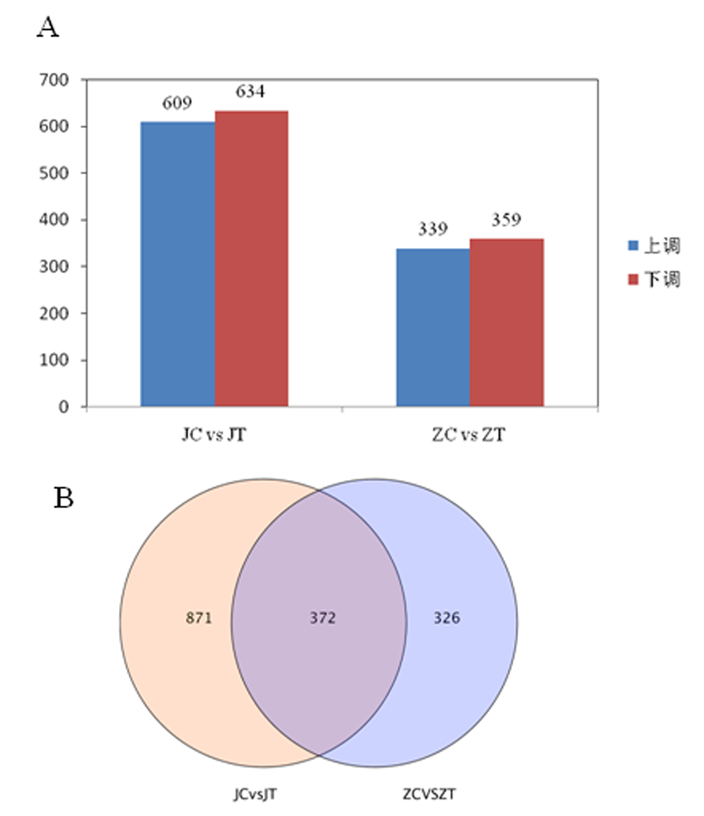 Fig.2 Analysis of differentially expressed genes between salt tolerant Jinshu16 and salt sensitive Jizhangshu 12 groups Notes:(A) Differential expression gene statistics; (B) Differential expression gene Venn diagram