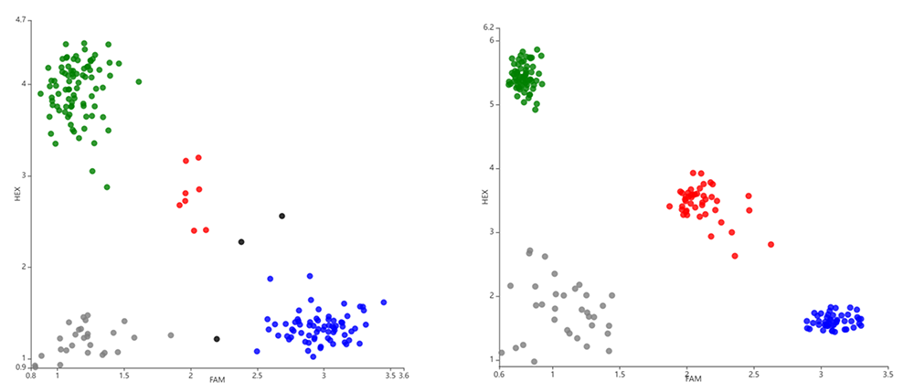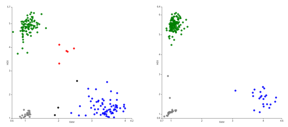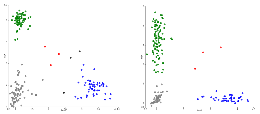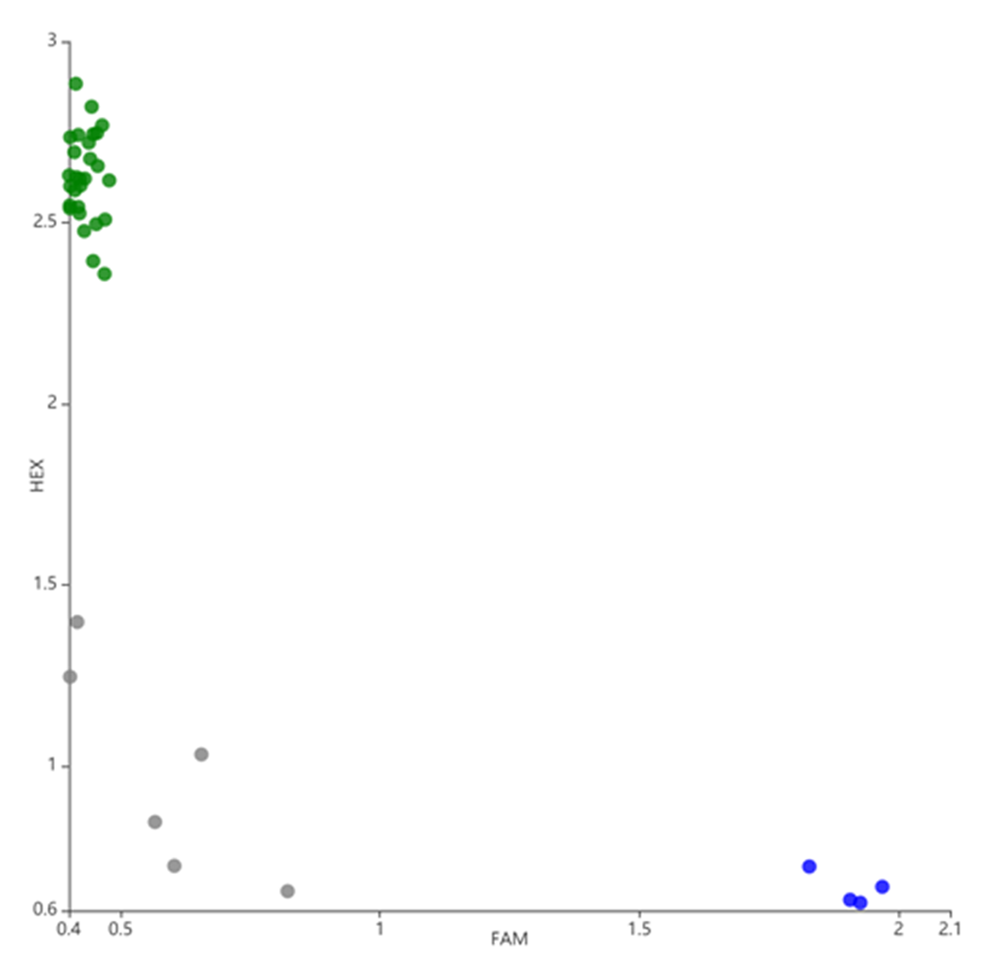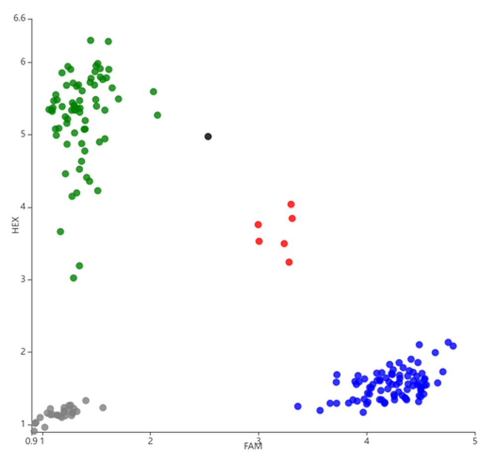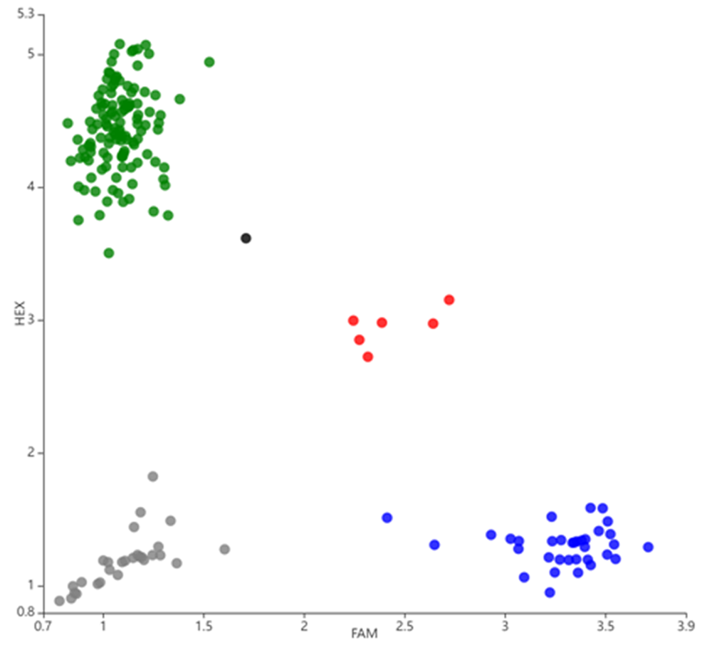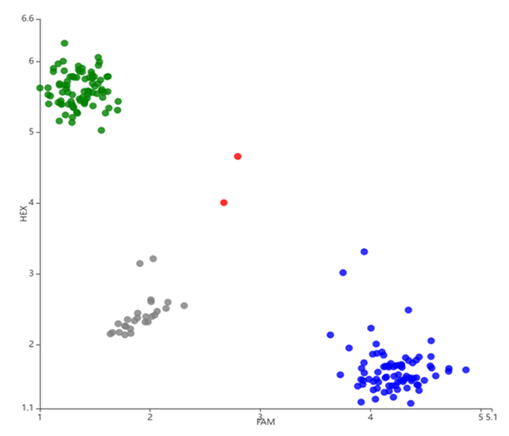 Fig.1 Detection results of tomato yellow leaf curl virus disease gene Ty-1 /Ty-2 Note: The green dot in the figure indicates the absence red dot indicates the presence of heter-ozygous resistance genes, the blue dot indicates the presence of homozygous resistance gray dot indicates the inability to the black dot indicates the negative control,the same as below