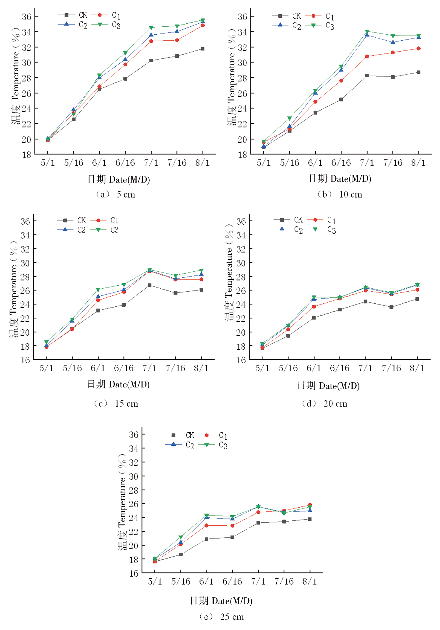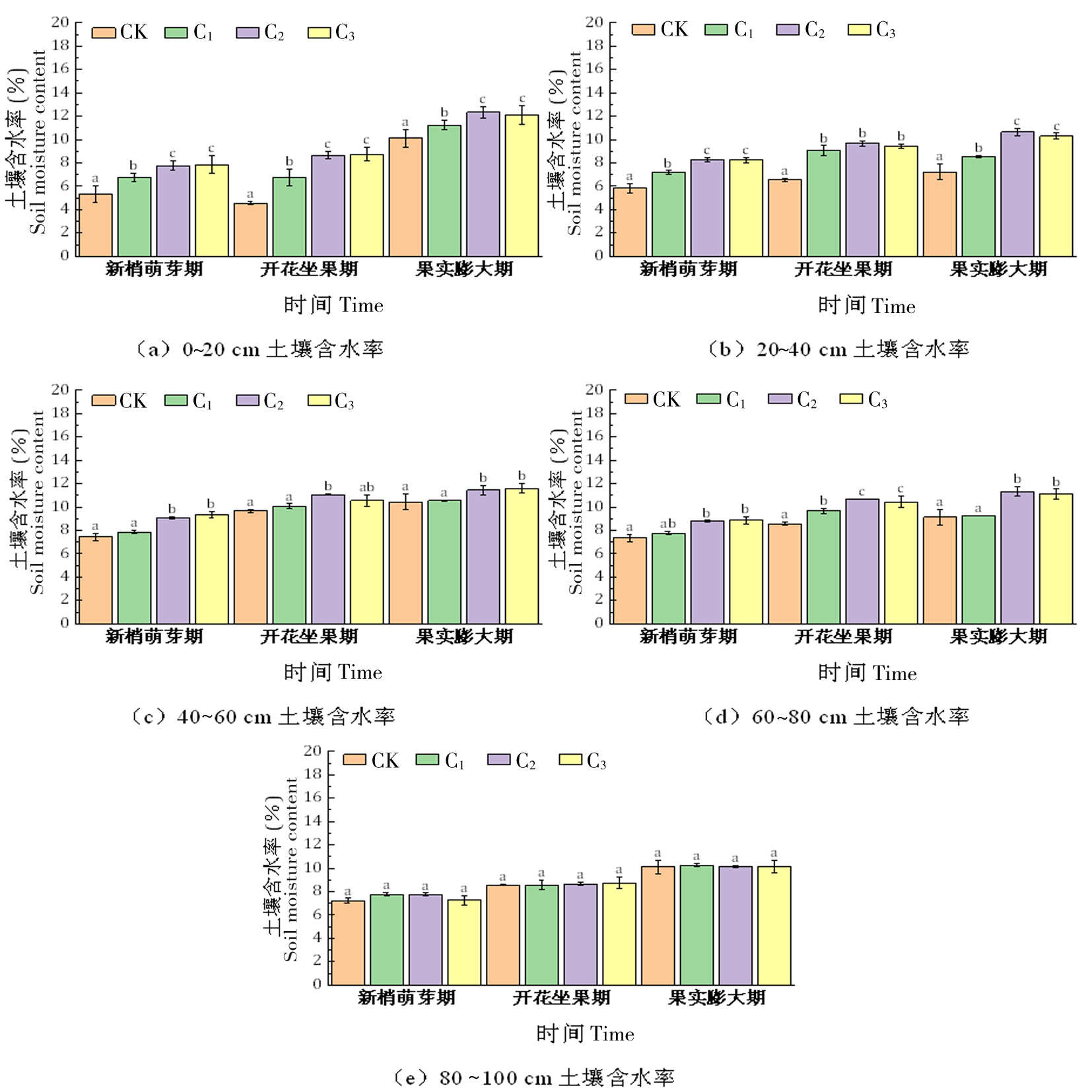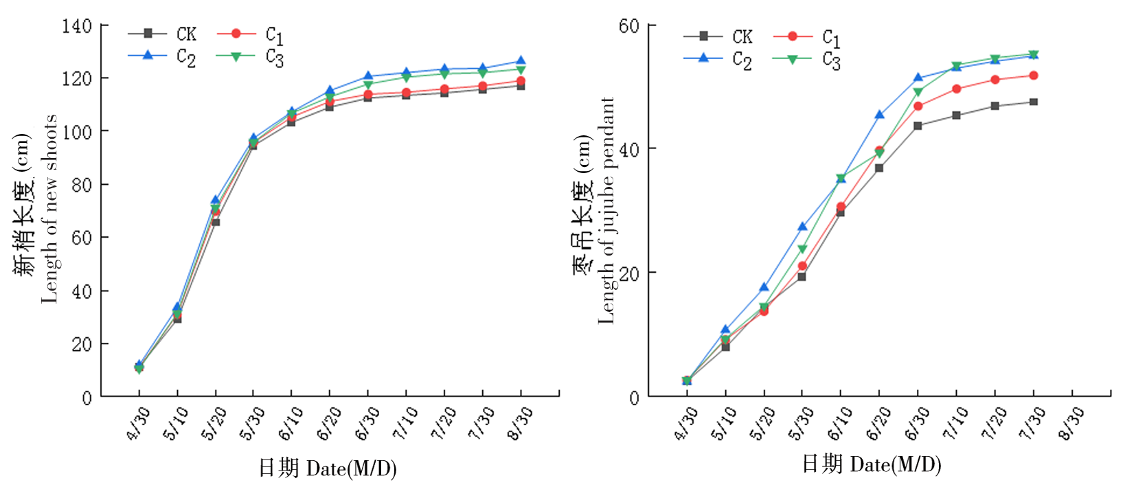 【Objective】 The objective of this study is to explore the effects of different width mulching patterns on jujube trees in Hotan Prefecture, Xinjiang. 【Methods】 In this study, three kinds of ground cloth covering jujube orchards with different widths were designed to study the effects of soil temperature, soil moisture and growth of jujube trees in jujube orchards compared with the control group without ground cloth. 【Results】(1) Different treatments in jujube orchards had a warming effect on soil temperature, and the ground temperature of each layer of different width cloth treatments increased, but the effect of air temperature on soil temperature decreased with the increase of depth; (2) The three kinds of ground cloth mulching had a certain moisture retention effect, and the water retention effect of C3 was better than that of CK. (3) Different widths of ground covering were beneficial to the growth of jujube trees, and the length of new shoots was C2>C3>C1>CK, and the length of jujube hanging was C3>C2>C1>CK, and the yields of C1, C2 and C3 treatments increased by 6.34%, 17.74% and 18.44%, respectively, compared with CK treatment. (4) The C2 treatment was the best, followed by the C3 treatment. 【Conclusion】 The application of horticultural ground cloth to jujube orchard mulching can improve soil temperature and moisture content, and has a good moisture retention effect on soil, which can promote the growth and yield of jujube trees.