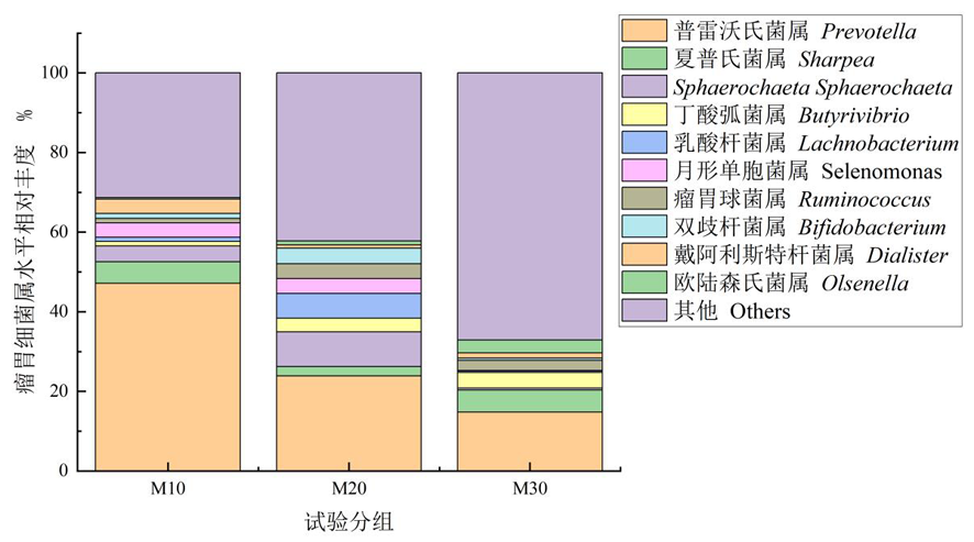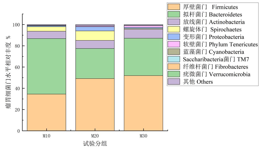 【目的】研究补饲苜蓿对15~55日龄湖羊羔羊养分表观消化率、瘤胃发酵参数及瘤胃微生物菌群结构的影响。【方法】试验选取48只体重(4.22±0.35) kg的第二胎次的双羔湖羊羔羊,随机分为3组,每组4个重复,分别饲喂含有10%(M1)、20%(M2)、30%(M3)苜蓿的饲粮,根据羔羊饲养管理的不同将试验分为15~34日龄和35~54日龄。【结果】54日龄时,30%苜蓿组羔羊体重较其它试验组有所提高,但无显著差异(P>0.05);15~34、35~54日龄,各处理组干物质表观消化率、粗蛋白质表观消化率、中性洗涤纤维表观消化率和酸性洗涤纤维表观消化率无显著差异(P>0.05);各试验组pH值无显著差异(P>0.05),10%苜蓿组NH3-N含量显著高于20%苜蓿组组和30%苜蓿组组(P<0.05),30%苜蓿组的总挥发性脂肪酸、乙酸和丁酸含量显著高于10%苜蓿组(P<0.05);10%苜蓿组的纤维素酶、木聚糖酶和果胶酶活显著高于30%苜蓿组(P<0.05);30%苜蓿组Shannon指数显著高于10%苜蓿组和20%苜蓿组(P<0.05);20%苜蓿组和30%苜蓿组的厚壁菌门丰度与10%苜蓿组相比有提升的趋势(0.05<P≤0.10),各试验组瘤胃细菌其他门水平无显著差异(P>0.05);10%苜蓿组普雷沃氏菌属丰度显著高于其他试验组(P<0.05),30%苜蓿组欧陆森氏菌属丰度显著高于其他试验组(P<0.05);20%苜蓿组瘤胃细菌胺和多胺生物合成通路数量显著高于其他试验组(P<0.05),30%苜蓿组氨酰-tRNA通路和芳香族化合物生物合成通路数量显著高于10%苜蓿组(P<0.05),30%苜蓿组代谢调节剂生物合成通路数量显著低于其他试验组(P<0.05)。【结论】15~55日龄羔羊饲粮中添加20%~30%的苜蓿为宜。