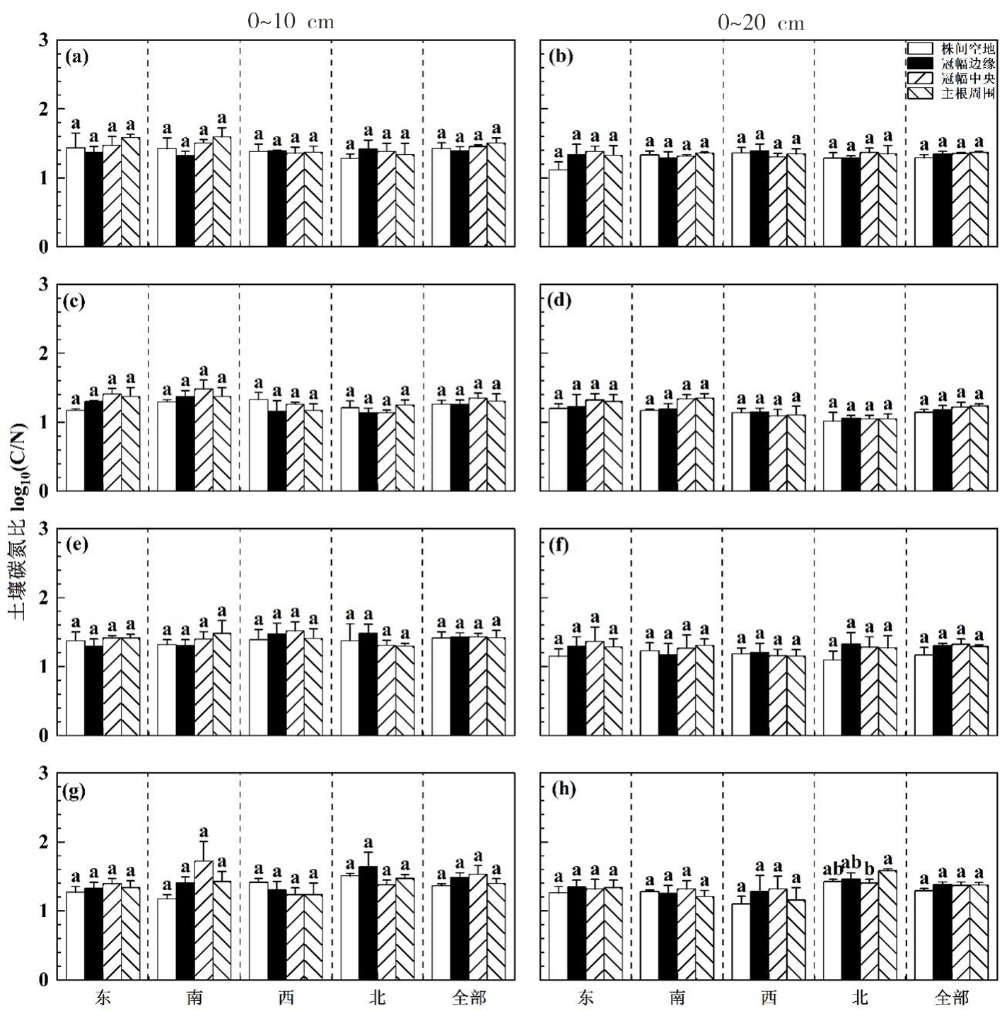 Fig.1 Variations of C/N under canopies of Kalidium caspicum at 0-10 cm and 10-20 cm (average value+standard error) Notes:(a,b),(c,d),(e,f) and (g,h) represented the large, medium, small and relatively small individuals of Kalidium caspicum respectively