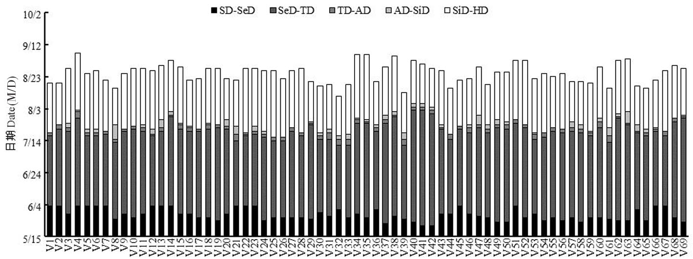 | 出苗期-抽穗期 SeD-TD | 均值(d) | 66.20 | 46.14 | 57.80 | 51.73 | 50.54 |