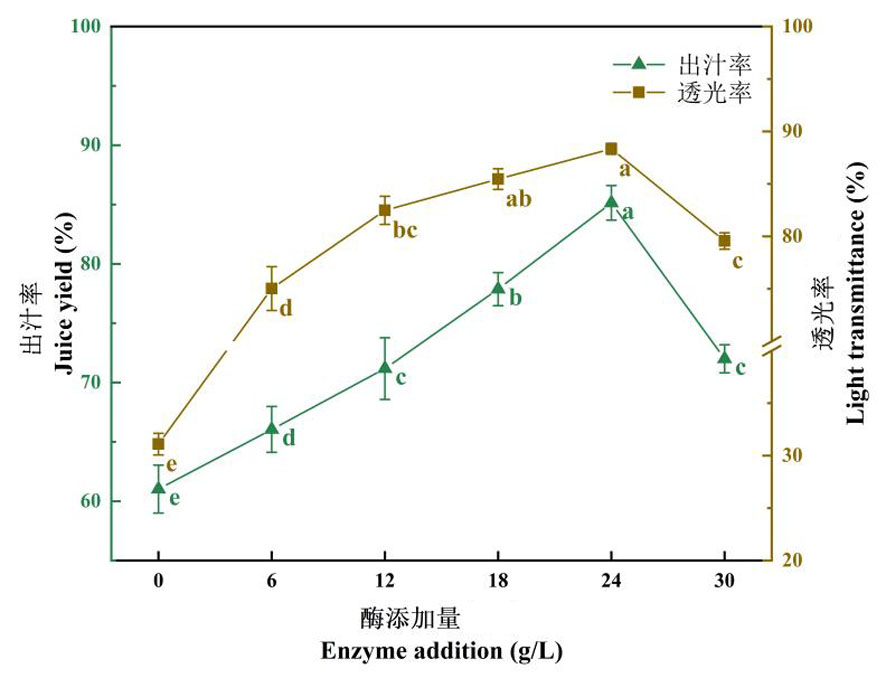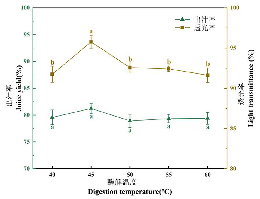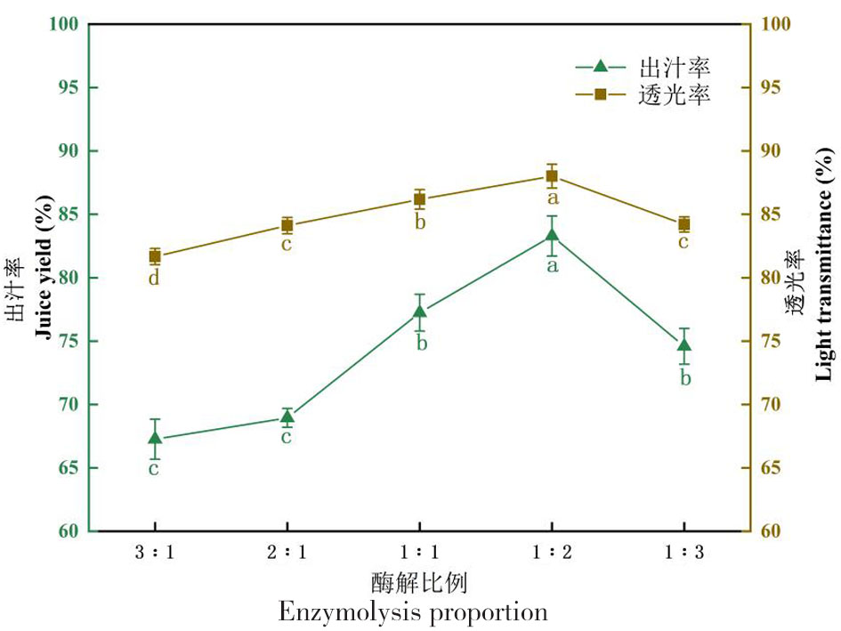 Fig.1 Changes of juice yield and light transmittance under different compound enzyme ratios Notes:Different lowercase letters indicate significant differences within the group(P<0.05), the same lowercase letters indicate no significant differences within the group(P>0.05),the same as below
