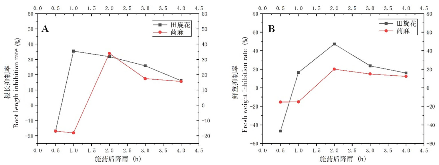 【目的】研究新型生物除草剂Thaxtomin A(TA)在田旋花和苘麻作用特性,为TA的实际应用提供理论基础。【方法】采用常规室内生物测定法,分析不同环境因子(温度、湿度和施药后降雨)和土壤因子(土壤有机质含量和土壤pH值)对TA防除田旋花和苘麻除草活性的影响。【结果】在35℃/30℃、50%湿度、土壤pH=9和有机质含量较高时,TA对田旋花其防除效果最佳,但是在施药后0.5 h降雨,会明显降低防效,应再次喷施;在30℃/25℃、70%湿度、土壤pH=8.0、土壤有机质含量较低时,TA对苘麻防效最佳,在施药后1 h内降雨,均会降低其防效,应适量补施药剂。【结论】不同气候因子和土壤因子对TA药效具有显著影响,而不同杂草种类环境因子的改变,对TA防效的影响不同,不同温度、湿度、光照时长、施药后降雨、土壤有机质和土壤pH值对其除草活性均有一定影响。