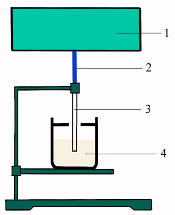 Fig.1 Test bench for Electrical parameters of fresh milk Notes:1,Vector network analyzer;2,Connecting cable;3,End opening coaxial probe;4,Liquid to be tested