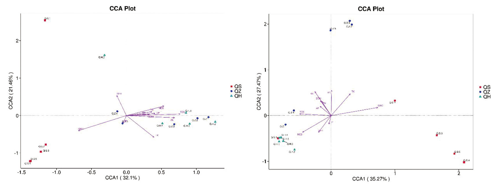 【Objective】 To study the characteristics of soil microbial communities under different habitats in Tarim River Basin, and explore the effects of soil environmental factors on soil microbial diversity, so as to provide a scientific basis for studying the important role of microorganisms in the growth and development of Populus euphratica riparia forest. 【Methods】 The soil of Populus euphratica forest in different habitats in the middle reaches of the Tarim River were taken as the research object, the soil microbial community structure and soil physical and chemical properties in 0-100 cm soil layer under three different habitats (arid, mesophilic and periodic flooding) were analyzed. The canonical correspondence analysis and Spearman correlation analysis were used to explore the characteristics of soil microbial community structure and its relationship with soil environment in three different habitats. 【Results】 (1) The soil organic matter, total nitrogen, total potassium, alkali-hydrolyzable nitrogen, available phosphorus and available potassium in mesophilic habitat were significantly higher than those in other habitats (P<0.05); the soil total phosphorus, nitrate nitrogen, ammonium nitrogen and total salt in desert habitat were significantly higher than those in other habitats (P<0.05). (2) There were significant differences in the abundance and diversity of microbial communities in three different habitats. The abundance and diversity of bacteria were the highest in periodic flooding habitat, while the abundance and diversity of fungi were the highest in desert habitat. (3) At the class level of microbial community composition, the dominant bacterial community was γ-Proteobacteria in mesophilic and periodic flooding habitats (relative abundance was 0.20 and 0.29, respectively), while it was Bacillus in desert habitat (relative abundance was 0.31). The dominant fungal community in the periodic flooding habitat was the class Ascomycetes (relative abundance was 0.22), the mesophytic habitat was the class Dictyostelium (relative abundance was 0.30), and the desert habitat was the class Tremella (relative abundance was 0.30). (4) The composition of fungi and bacteria communities in the mesophytic and desert habitats was similar, but the periodic flooding habitat was significantly different from them. (5) The composition of soil microbial communities in the three habitats of P. euphratica riparia was mainly affected by soil total salt, soil water content, available potassium, and nitrate nitrogen. 【Conclusion】 The soil nutrient conditions of P. euphratica riparia in the mesophytic habitat in the middle reaches of the Tahe River are the optimal. The periodic flooding habitat has a richer bacterial microbial community, while the desert habitat has a richer fungal microbial community. The soil environment has a significant effect on the composition of microbial communities.