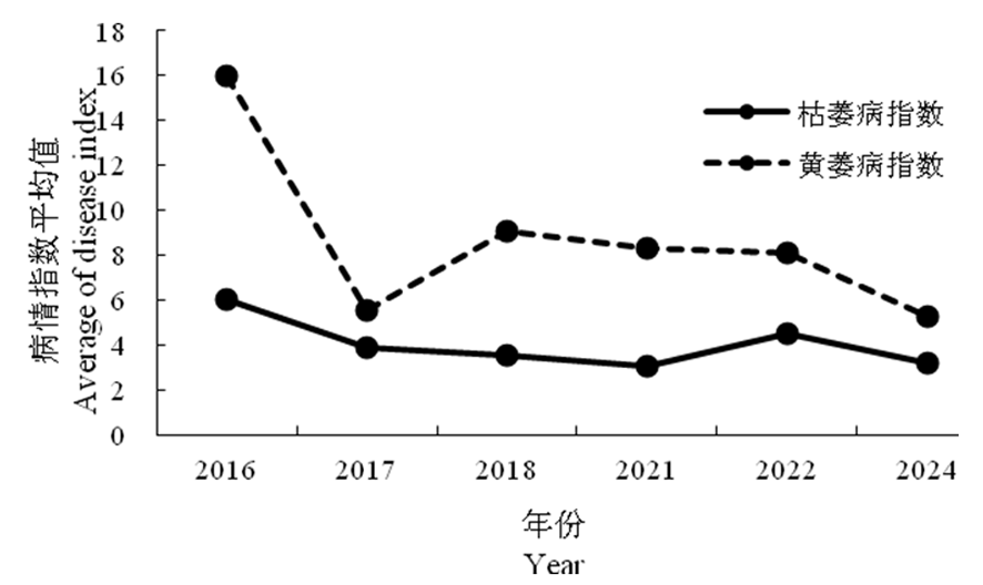 Tab.4 Average values and ranges of disease severity indices for Xinjiang approved extra-long staple cotton varieties from 2016 to 2024