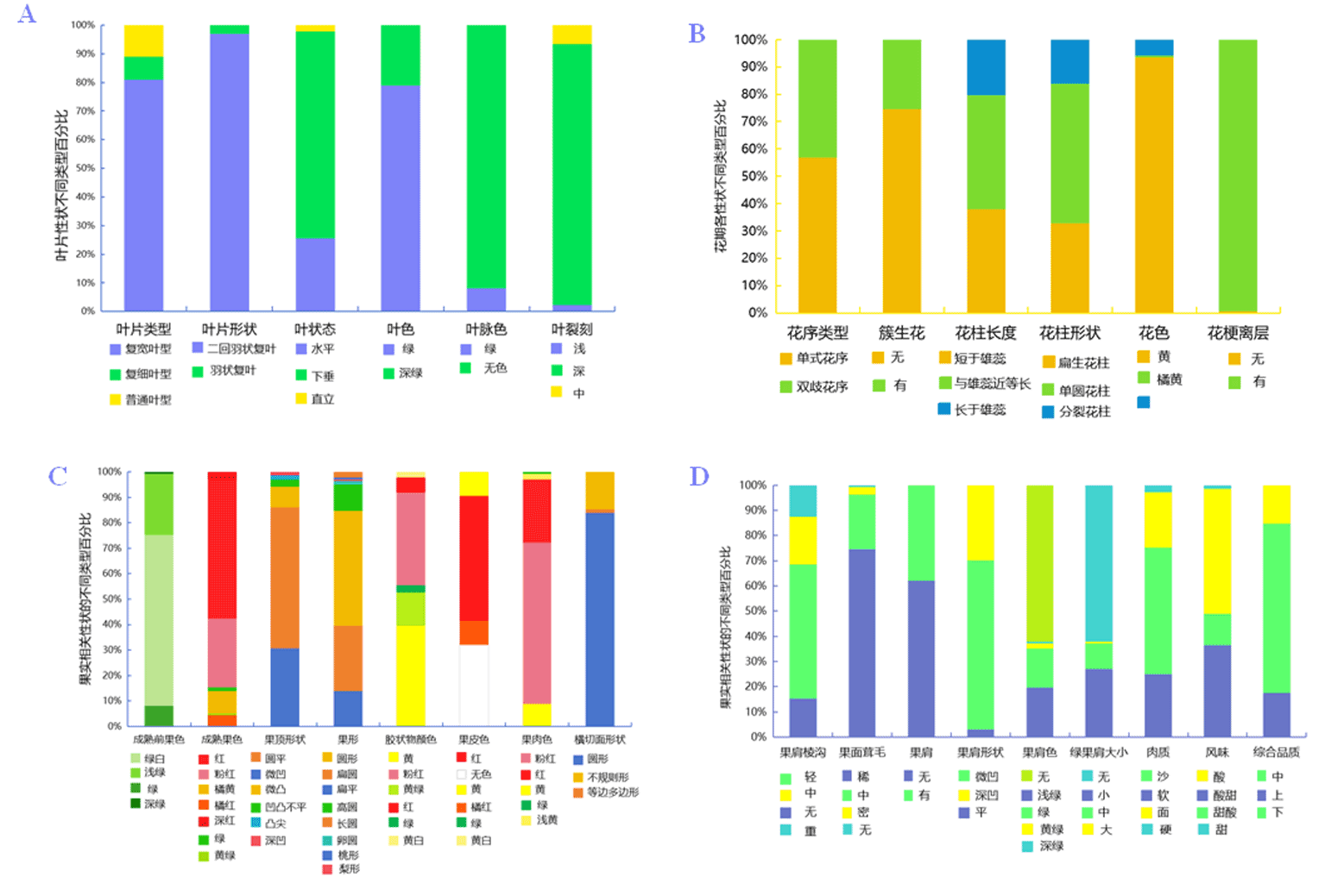 Fig.2 Proportional distribution of qualitative trait categories in tomato germplasm resources from the third national census in Xinjiang Notes:(A) Leaf-related Traits, (B) Flowering Period-related Traits, (C, D) Fruit Quality-related Traits