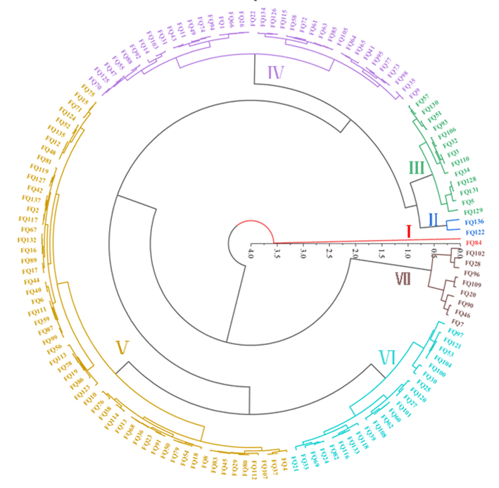 | 下胚轴颜色(HC) | 0.043 | 簇生花(FIC) | 0.568 | 果肩形状(FSS) | 0.732 |