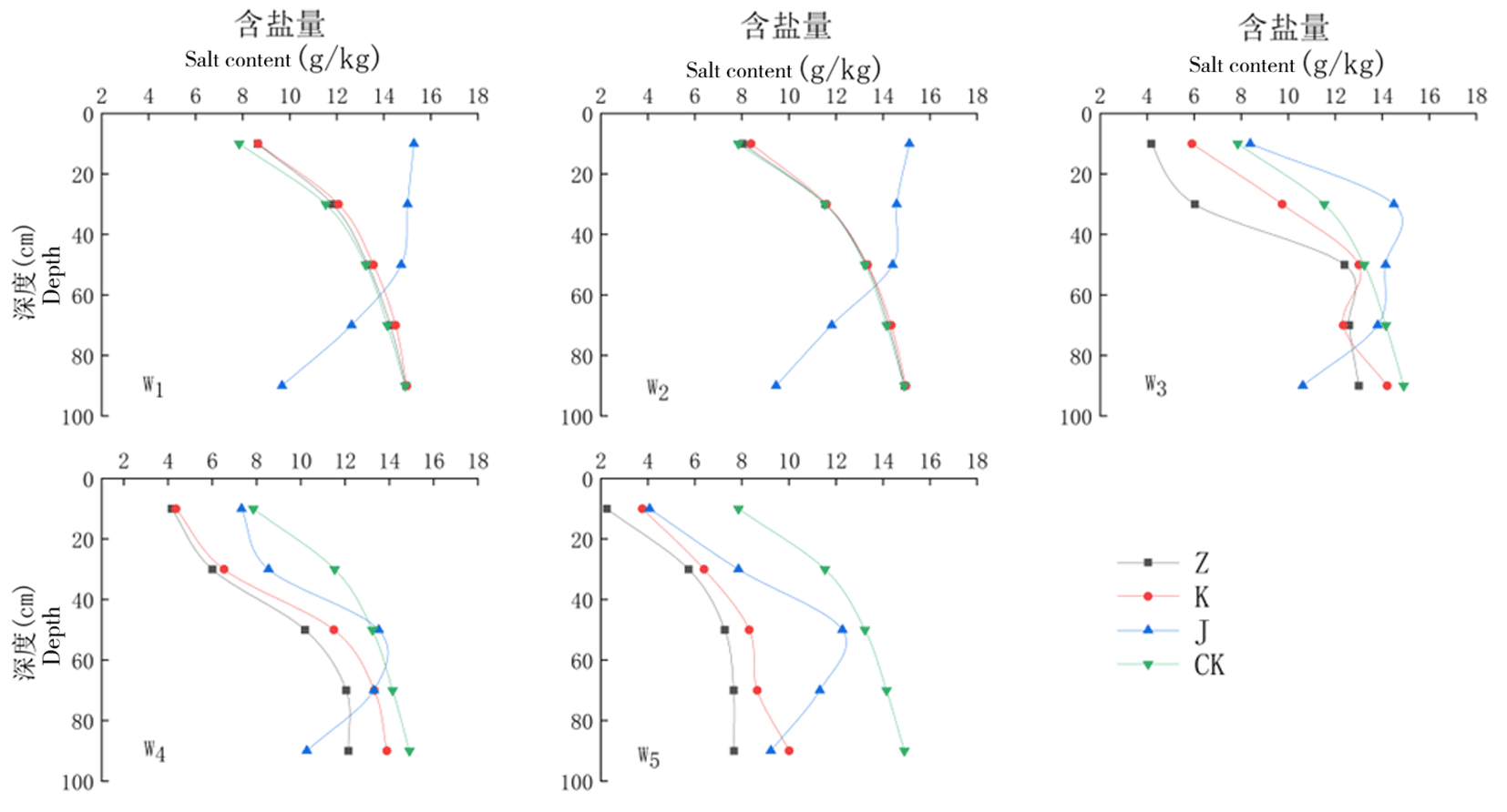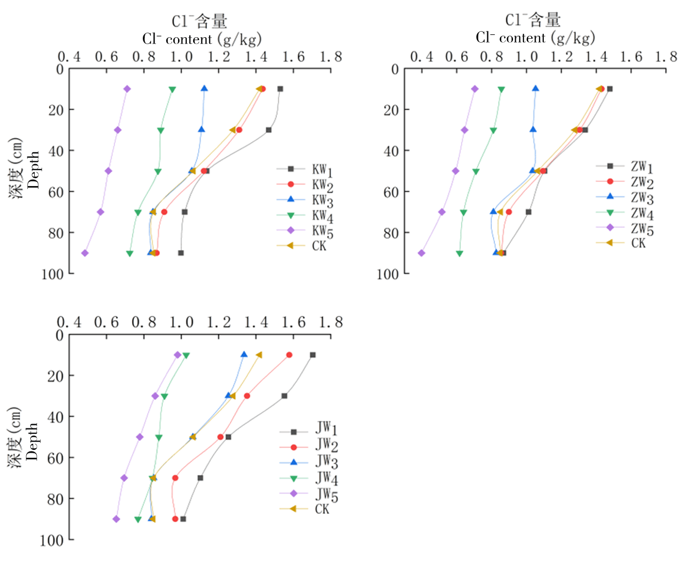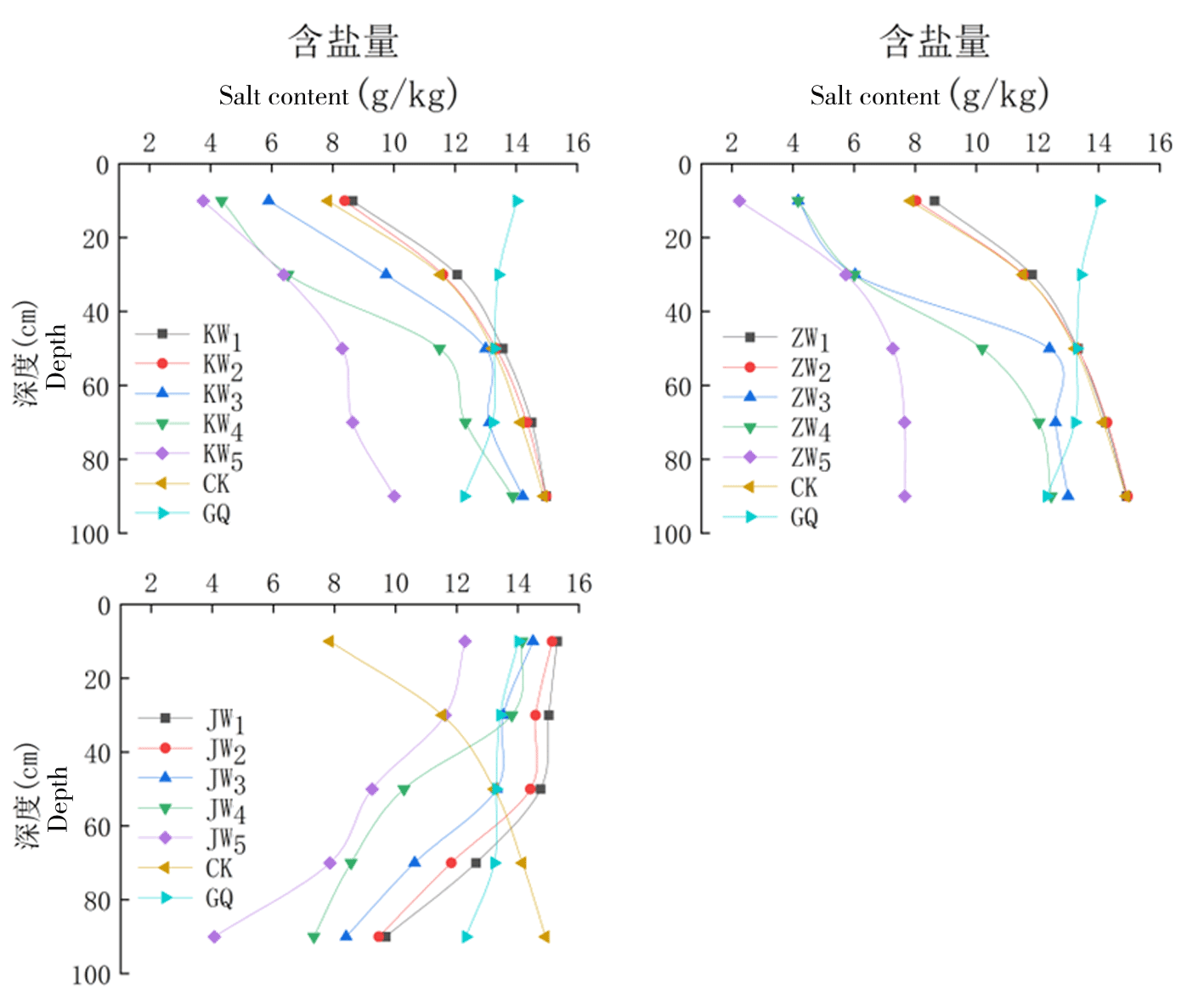 | 土层深度 Soil depth (cm) | 总盐 Total salt (g/kg) | (g/kg) | (g/kg) | Cl- (g/kg) | (g/kg) | Ca2+ (g/kg) | Mg2+ (g/kg) | K+ (g/kg) | Na+ (g/kg) |