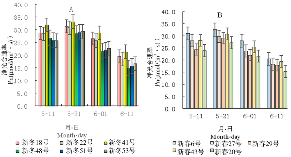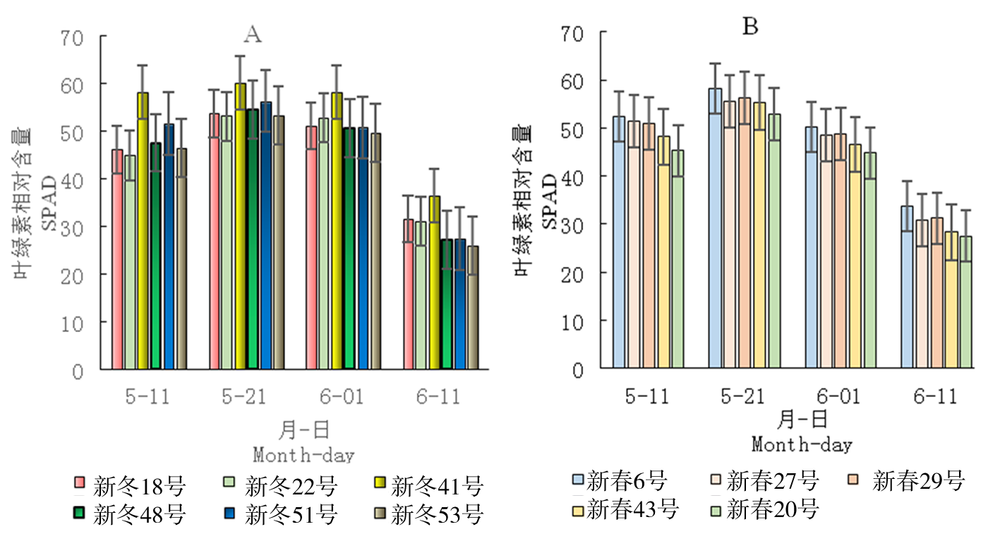 【Objective】 To ascertain photosynthetic characteristics and grain-filling rate and yield of different winter and spring wheat cultivars under extremely-late sowing. 【Method】 The suitable sowing period of winter wheat is from 20th to 30th in September, and the planting period of this test is October 31, with a delay of 31-41 days sowing. Under ultra-late sowing conditions,the randomized block designed field experiment was compared the difference between photosynthetic characteristics, grain-filling rate and yield of different winter and spring wheat cultivars in the field. 【Result】 The leaf chlorophyll content, net photosynthetic rate, transpiration rate and stomatal conductivity of winter and spring wheat varieties varied among different cultivars. The yields of Xindong 41 and Xinchun 6 were higher than other cultivars, which were 60.2 and 58.1, 33.1 μmol/(m2·s) and 32.5 μmol/(m2·s), 10.22 m mol/(m2·s) and 10.41 m mol/(m2·s), 0.33 mol/(m2·s) and 0.36 mol/(m2·s). The peak rate of the maximum grain-filling rate of spring wheat cultivars occurred 18-20 days after, while winter wheat occurred 15-17 days after. The yields of Xindong 41 and Xinchun6 were relatively high, ranging from 7,812.3 kg/hm2 to 7,935.6 kg/hm2. The number of high-yielding spikes was 431.7×104/hm2~475.2×104/hm2, the number of spikes was 31.6-36.3, and the number of thousands of grains weight was 51.7~52.8 g.【Conclusion】 Comprehensively considering all the factors, Xindong 41 and Xinchun 6 are more suitable for ultra-late winter sowing in northern Xinjiang.