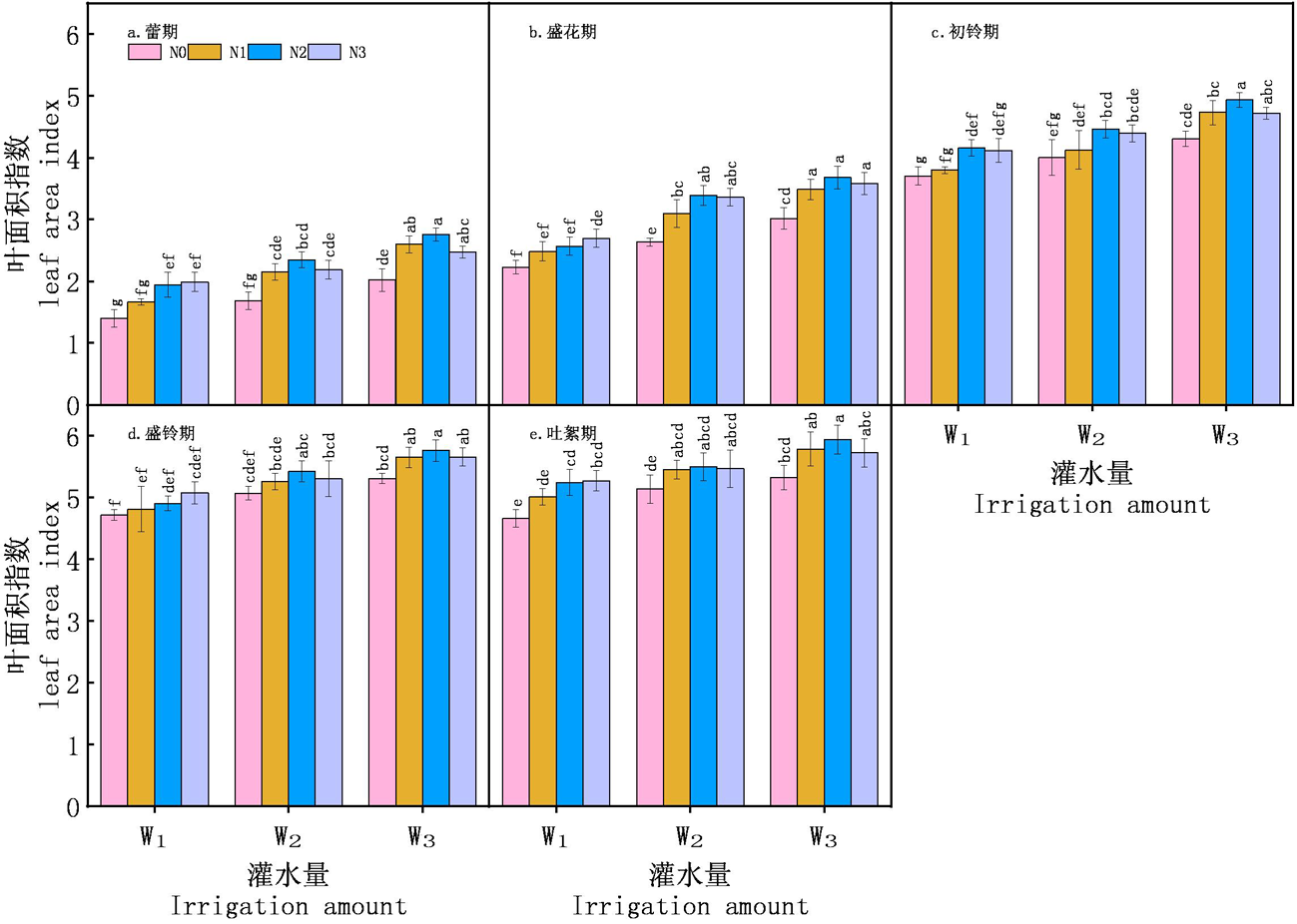 Tab.2 Significance level of different water and nitrogen treatments on leaf area index of mechanically harvested cotton