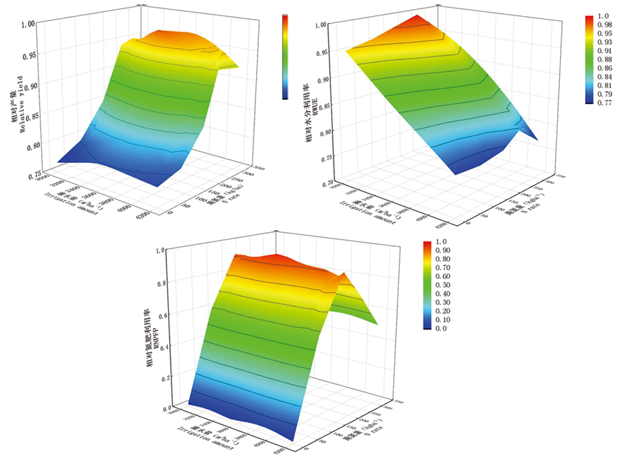 | 氮肥偏 生产力 PFPN(η3) | 氮肥偏生产力=26.801+2.4×10-2W-3.4×10-6W2-2.49 ×10-1N+2.66×10-4N2+1.825×10-6WN | 3 594 | 240 | 26.28 | 0.996 | 0.000 |