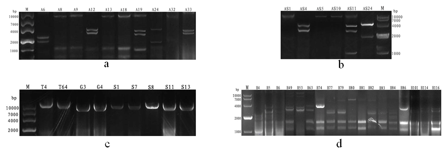 Fig.1 Detection of dsRNA in Alternaria solani isolate Note:M, DNA Maker; A、AS、T、G、H, strain(a.the samples collected in 2015,b.collected in 2016,c and d.collected different season in 2022)