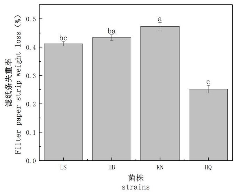 Fig.3 Filter paper strip weight loss results Notes: Different strains containing different letters indicate significant differences (P<0.05), and the same letters indicate non-significant differences (P>0.05).